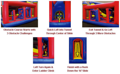 There you will find 3 more challenging obstacles to go through before you enter the ladder climb which leads you to the top of our 16' slide. From the top of the slide, you're guaranteed a thrilling ride down to the bottom. Even 13 year olds will get a rush from our 50 degree sliding angle!